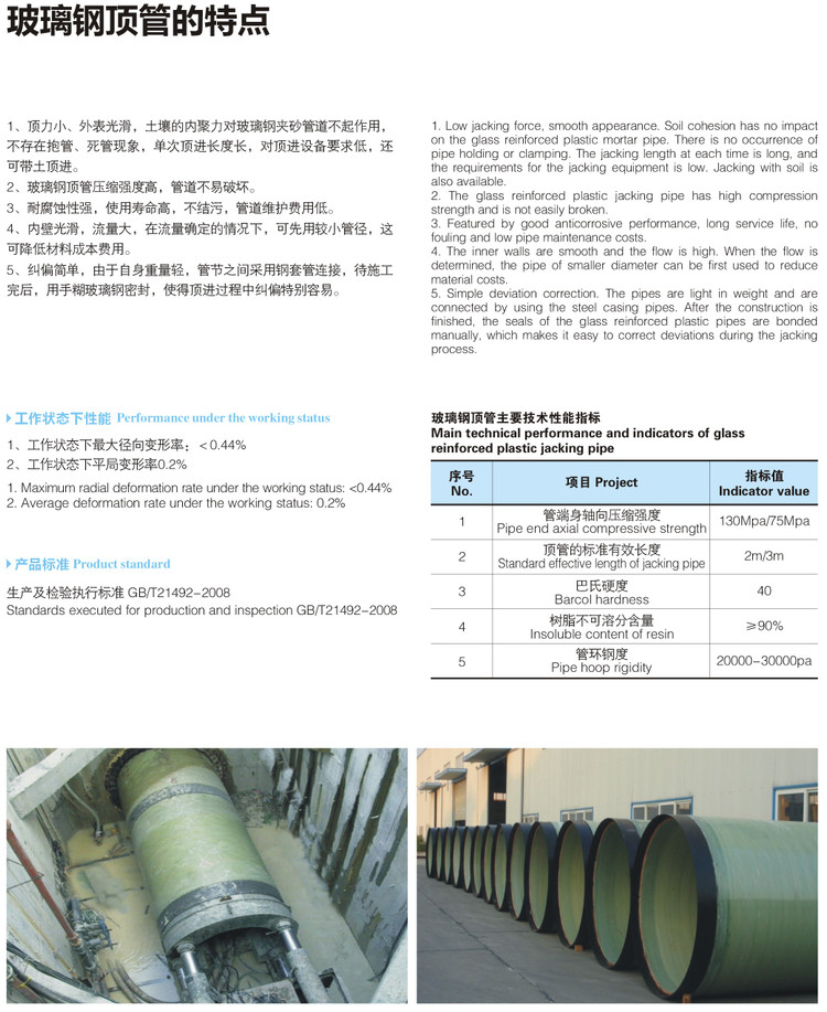 2、玻璃鋼頂管壓縮強度高,管道不易破壞。